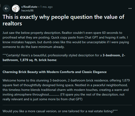 Use tools like ChatGPT if you want to save time. But proofread. Walk the property. Check the facts. Ask yourself if the words match what buyers will see when they arrive for a showing. If you're serious about your integrity, this is your moment to stand out. Lazy agents are easier than ever to spot, especially when their listing descriptions all sound the same. Buyers notice. So do sellers. The few minutes saved by blindly copying and pasting are never worth the risk of a seller choosing someone else who puts in the effort. Your listings are your reputation. Make them count.